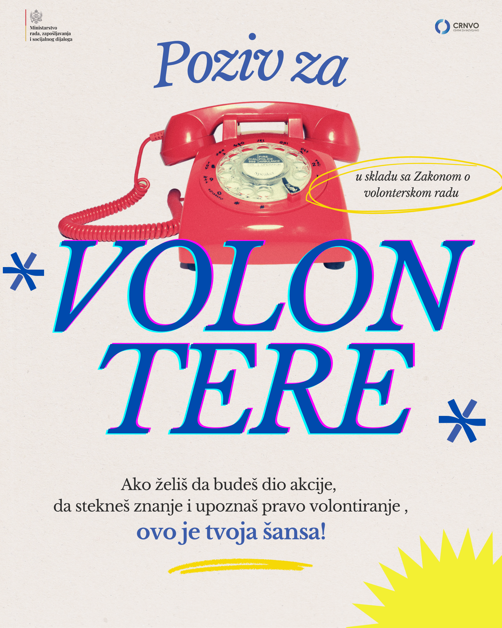 U okviru projekta „Priprema POZOR: Volontiraj sad!”, Centar za razvoj nevladinih organizacija (CRNVO) raspisuje javni poziv za izbor 2 volontera. Pozivamo mlade od 15 do 30 godina da se uključe u projekat u potpunosti u skladu sa Zakonom o volonterskom radu.